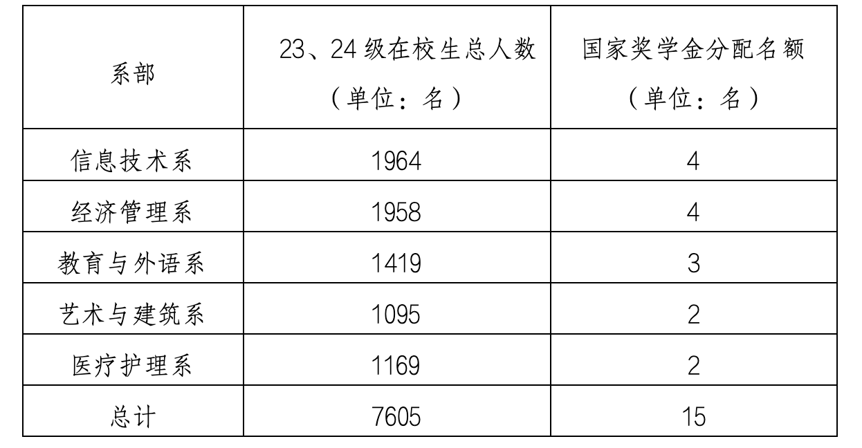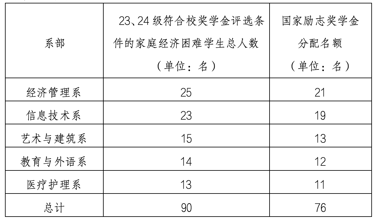 1、分配名额按照23、24级符合校奖学金家庭经济困难学生比例分配,即各系分配名额=各系符合校奖学金家庭经济困难学生在校人数/学院符合校奖学金家庭经济困难学生在校总人数*总名额指标。