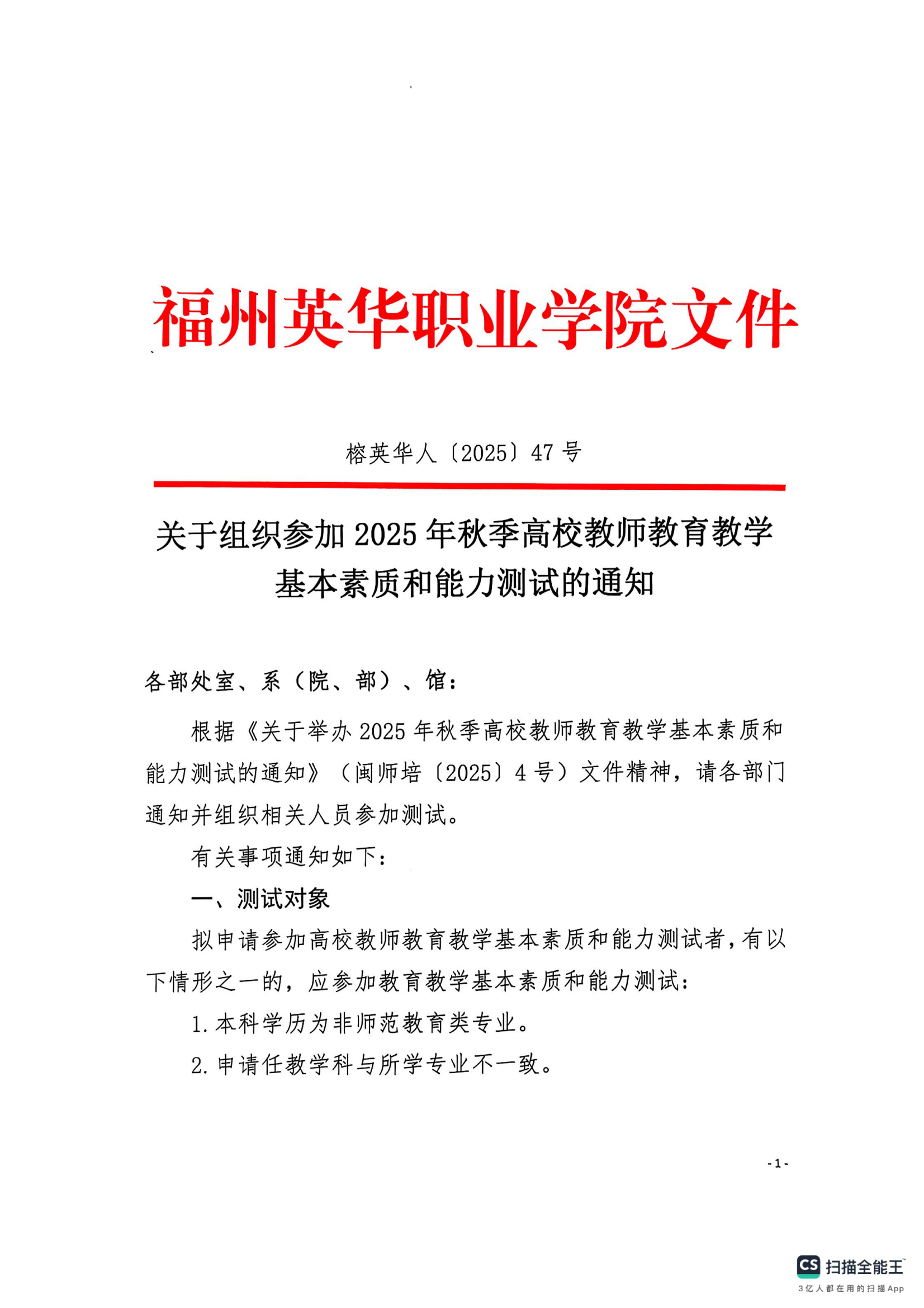 榕英华人〔2025〕47号关于组织参加 2025 年秋季高校教师教育教学基本素质和能力测试的通知.pdf