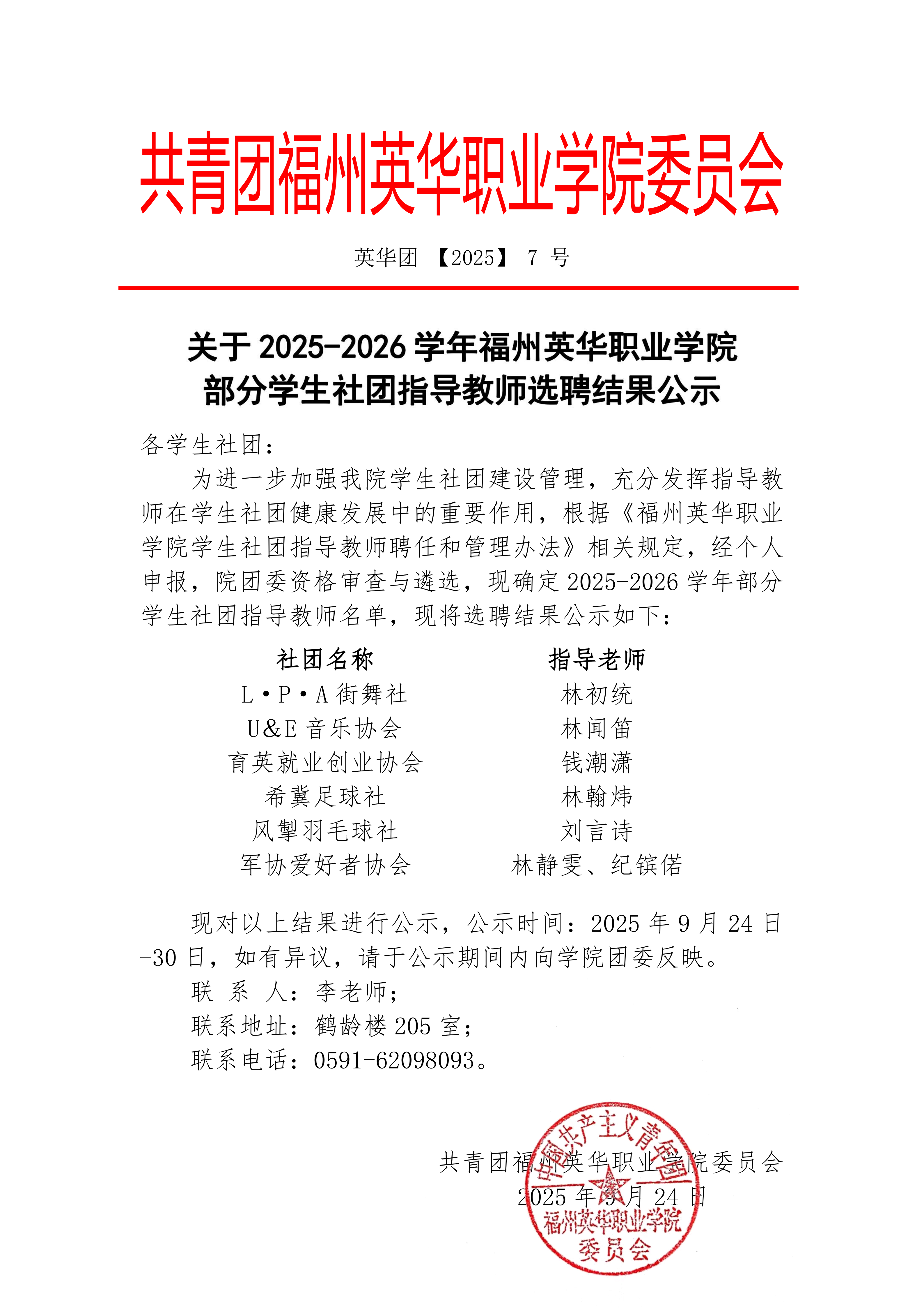 关于2025-2026学年福州英华职业学院 部分学生社团指导教师选聘结果公示