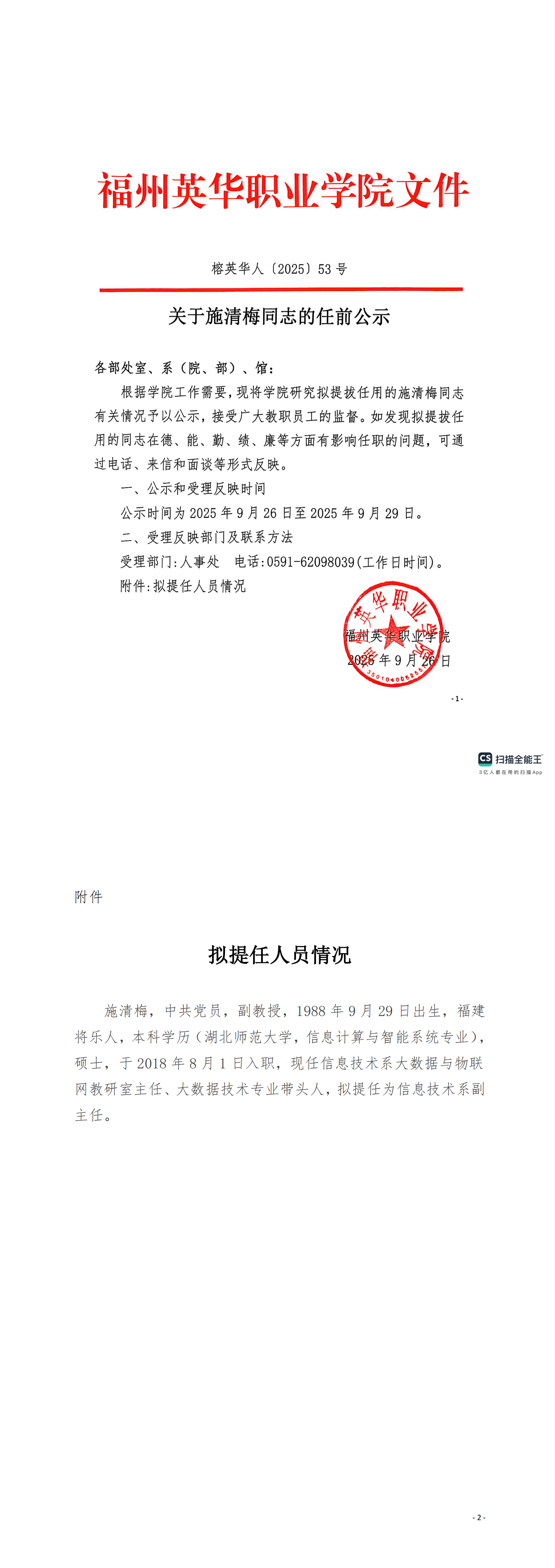关于施清梅同志的任前公示