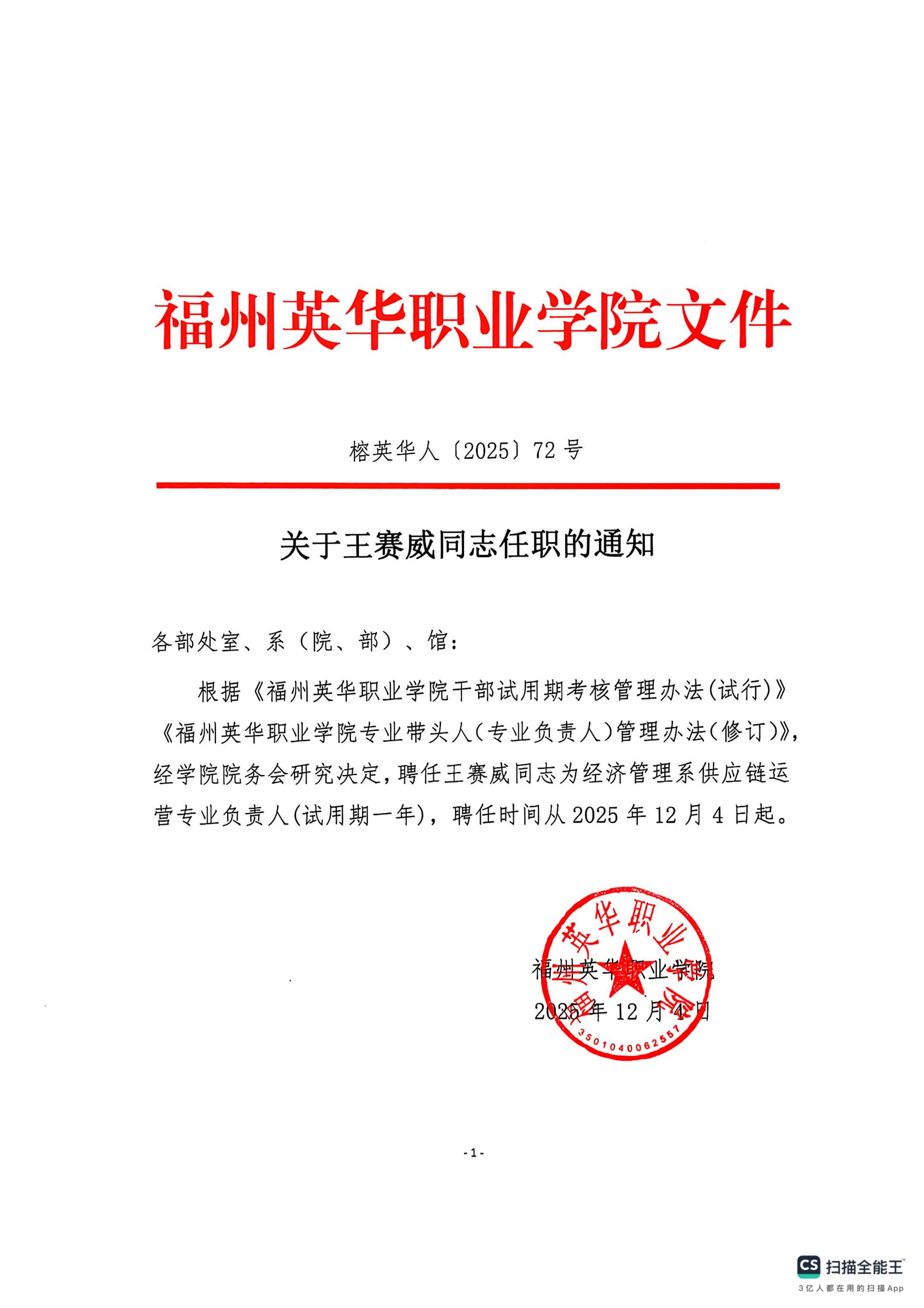 关于王赛威同志任职的通知