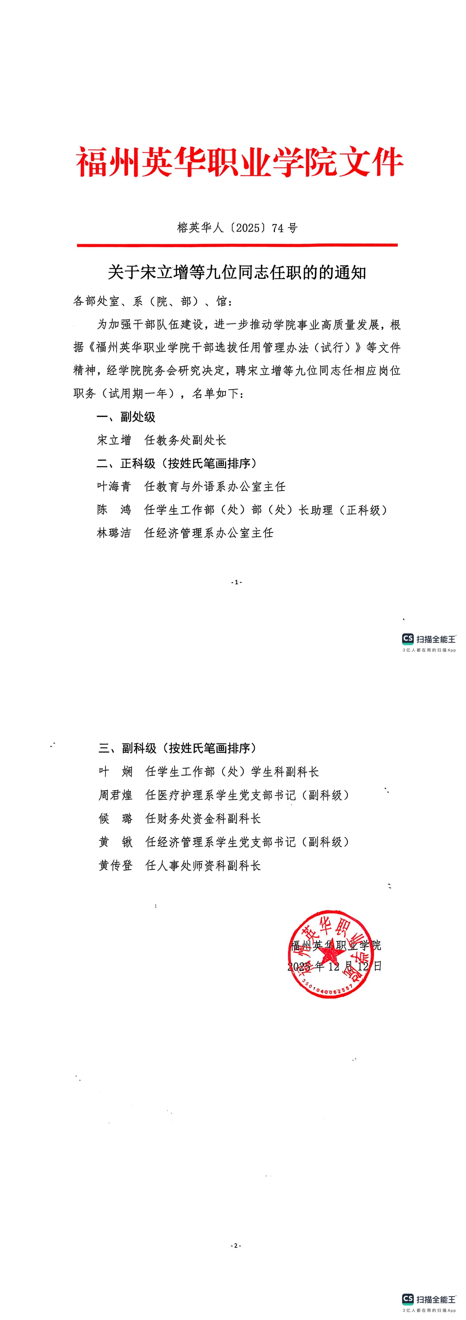 关于宋立增等九位同志任职的的通知