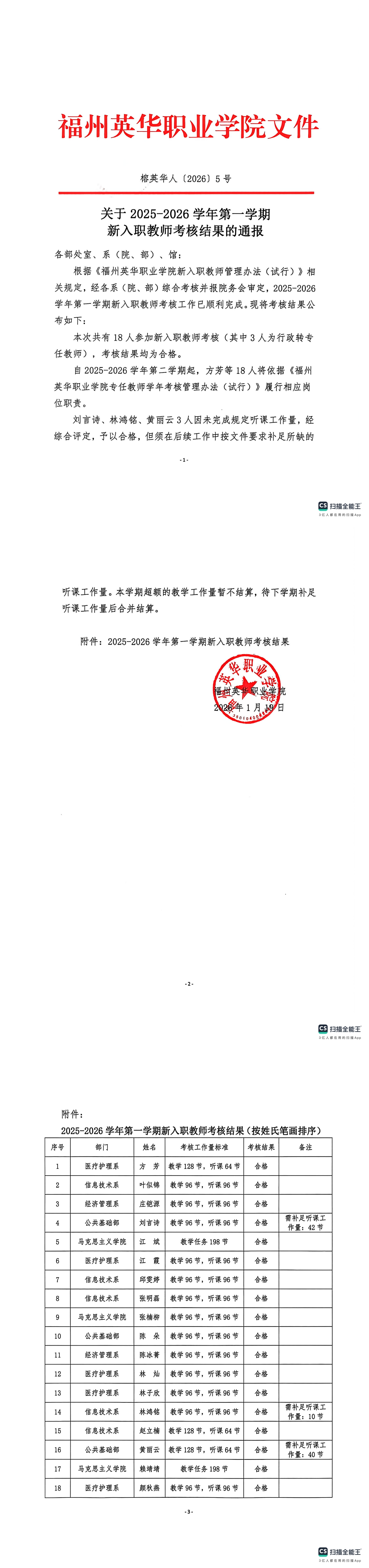 关于2025-2026学年第一学期新入职教师考核结果的通报