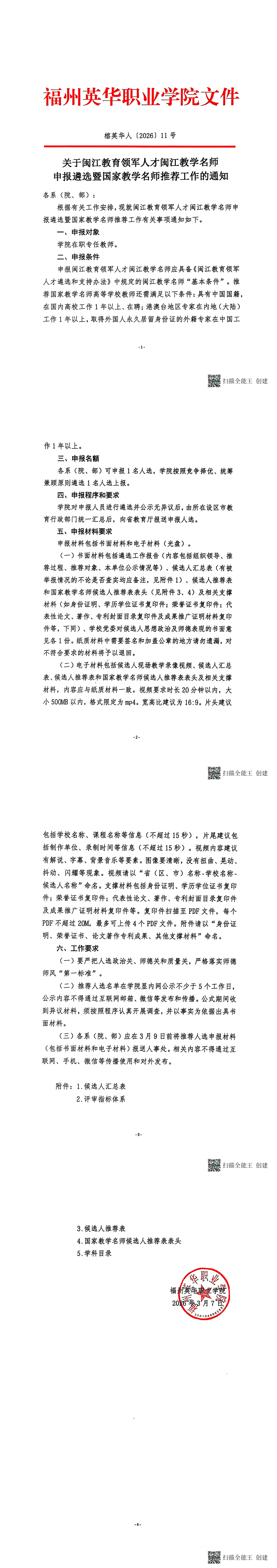 关于闽江教育领军人才闽江教学名师申报遴选暨国家教学名师推荐工作的通知附件.zip