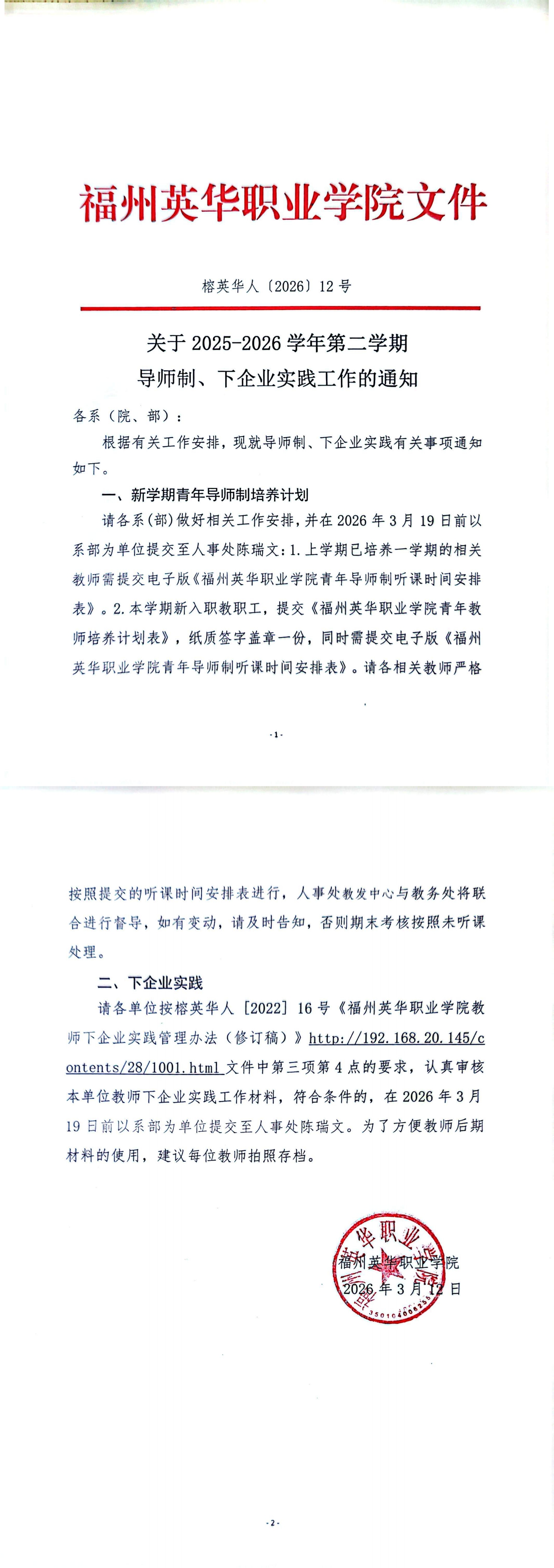 关于2025-2026学年第二学期 导师制、下企业实践工作的通知