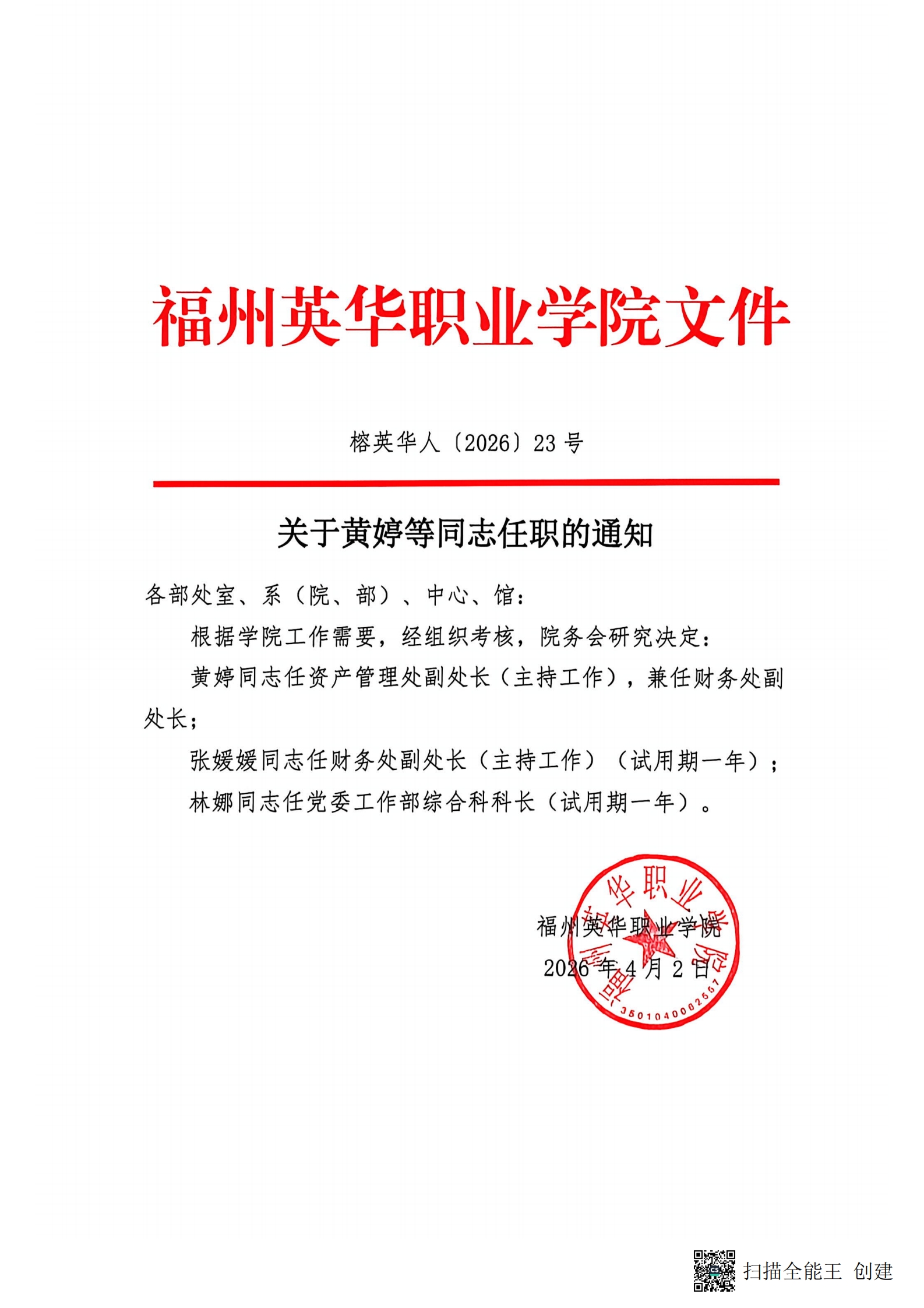关于黄婷等同志任职的通知