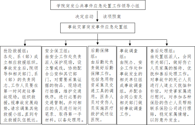 1、抢险救援组:各处(室)、系(部)按照学院总体应急预案要求,成立相应救援组织,统一纳入学院总体应急预案体系中。事故发生后,院领导和相关部门的负责同志、工作人员要在第一时间赶往事故现场,组织救援。