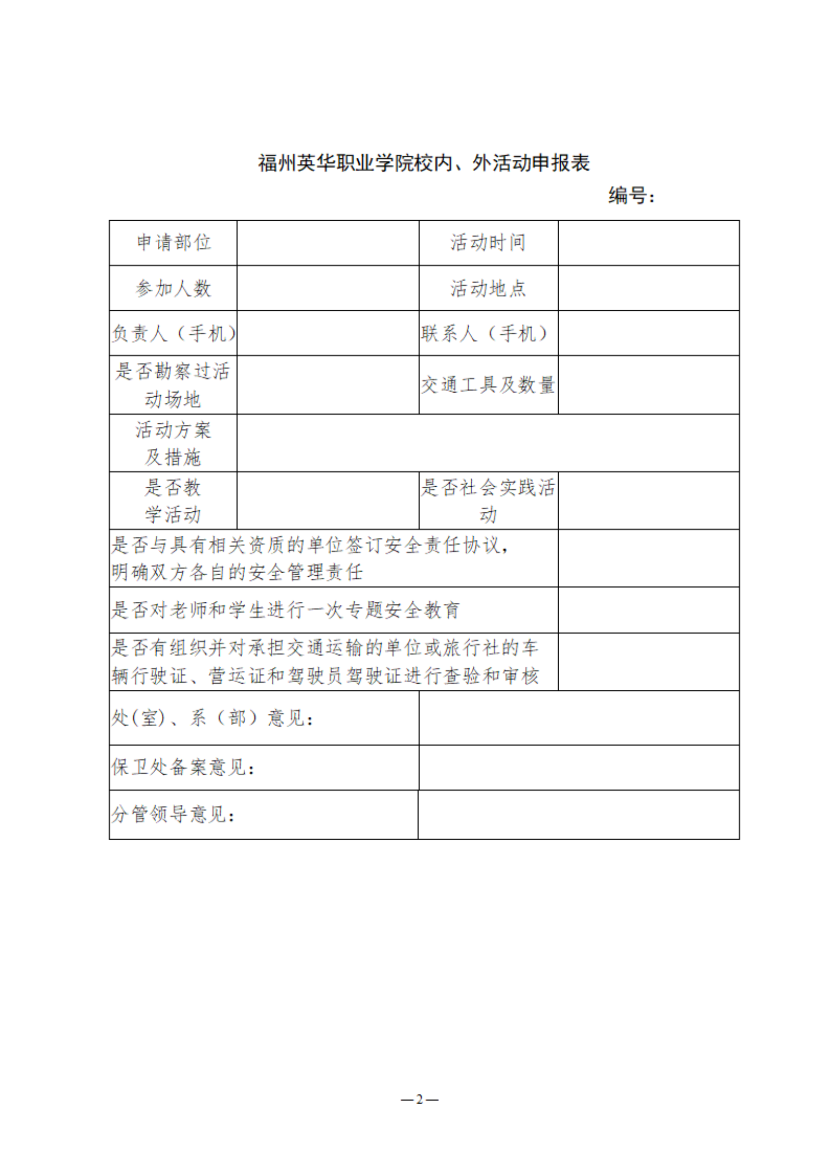 福州英华职业学院校内、外活动申报表