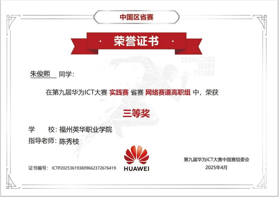 华为ICT大赛是华为公司面向全球大学生打造的ICT人才竞技交流赛事,旨在促进学生ICT技术知识的学习与实践创新能力的提升。本次比赛竞争激烈,涵盖知识储备、实践操作与综合应用等多方面考核。朱俊熙同学在比赛中沉着应对,凭借过硬的网络技术知识与实操能力,最终脱颖而出,获得佳绩。