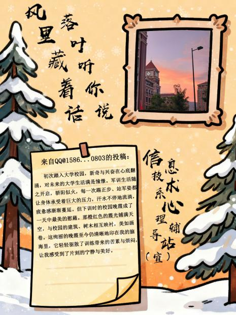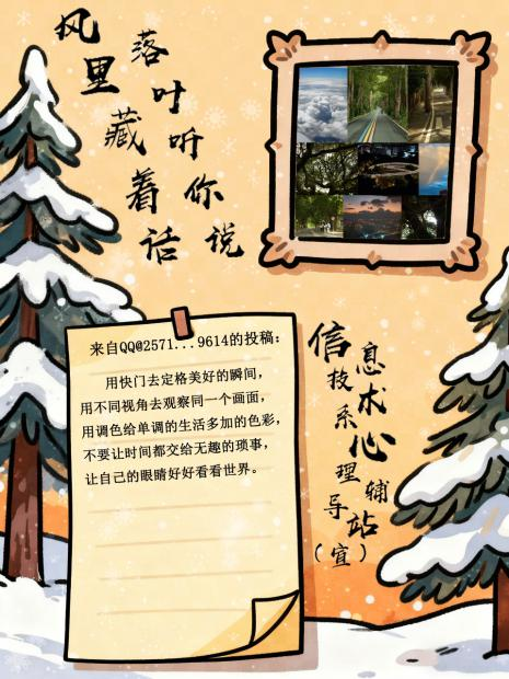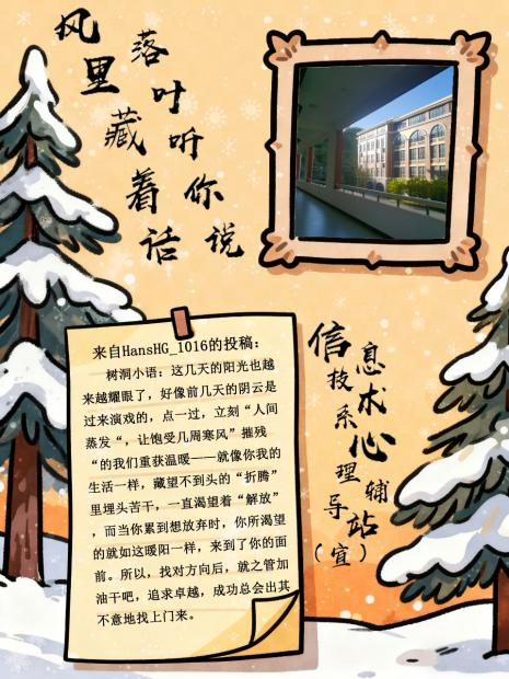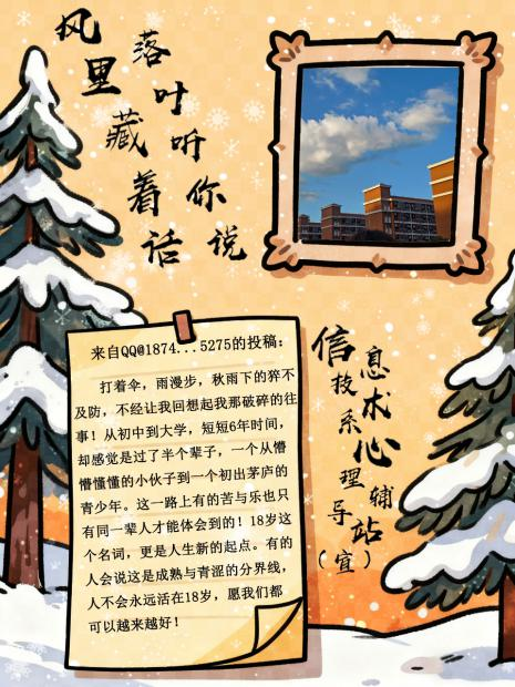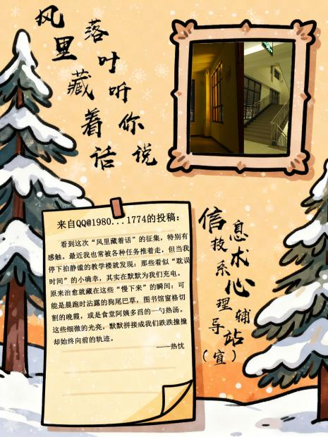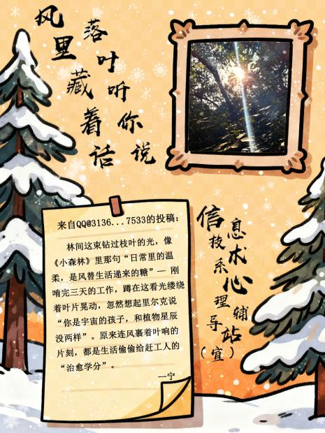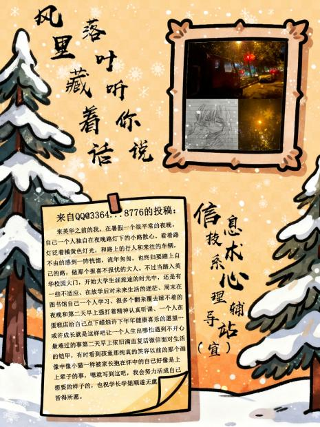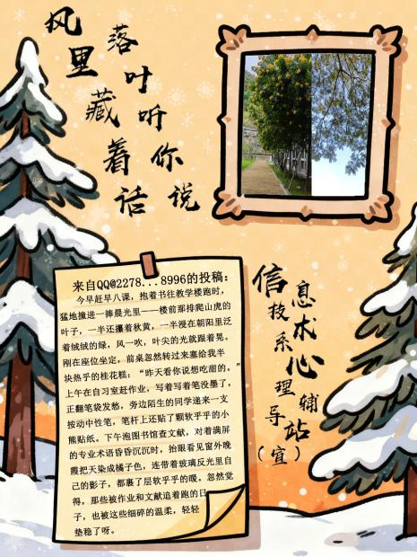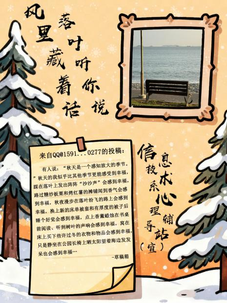 当最后一片银杏叶落在长椅上,信息技术系“真心话·但不冒险”第二期活动也正式落下帷幕。以“风里藏着话 落叶听你说”为主题的这场秋日树洞,接住了数十份来自同学们的“生活温度”——那些镜头里的治愈画面、文字里的真实情绪,都成了这个深秋最柔软的注脚。