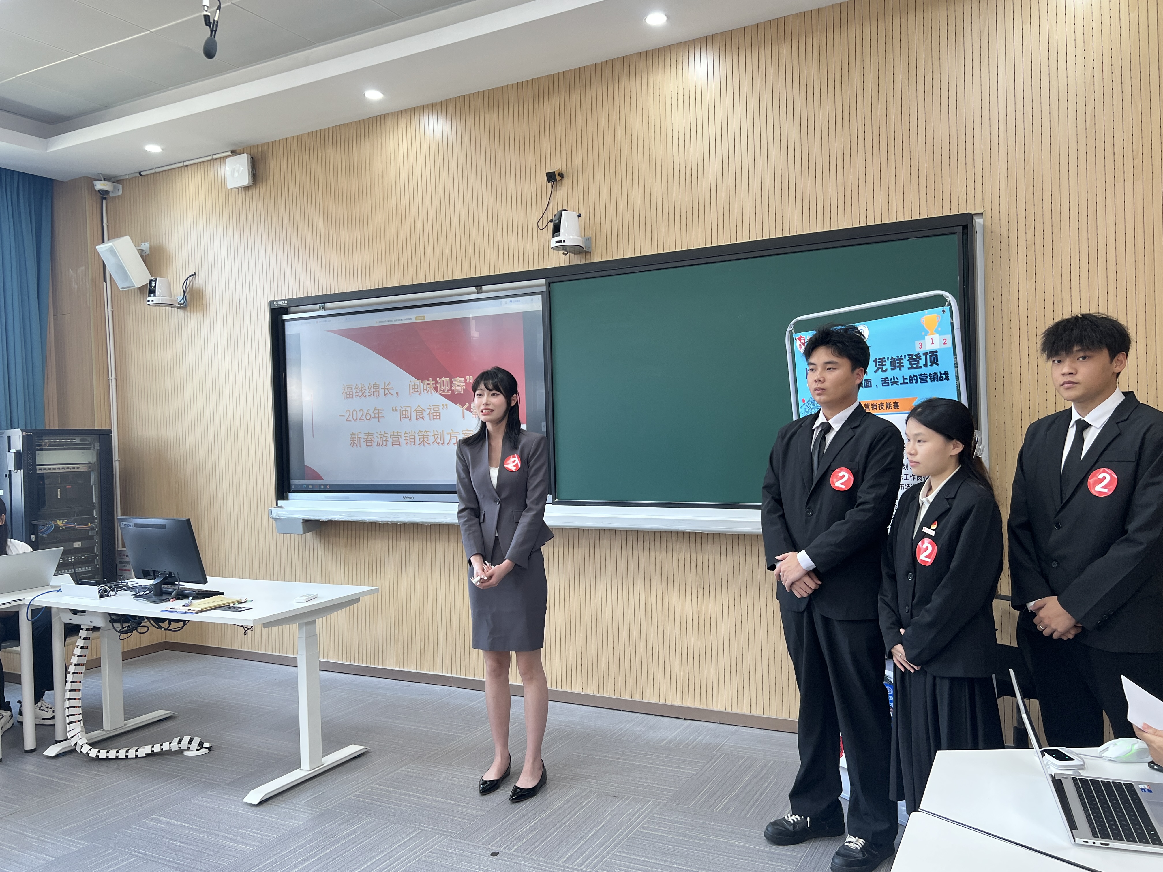 比赛现场气氛热烈,精彩不断。在营销活动策划方案展示环节,各队伍依次上台,通过详细的 PPT 汇报,清晰地阐述了各自的营销策略与创意亮点。有的队伍提出结合传统文化节日举办线上线下互动体验活动,有的则主打年轻消费群体,设计了趣味横生的社交媒体挑战赛。在新媒体营销海报设计展示环节,同学们巧妙运用图文混排,将 “闽食福” 线面的传统工艺与现代营销元素融合,制作出一张张富有吸引力的海报,充分体现了他们对新媒体传播特点的深刻理解和创意表达能力。