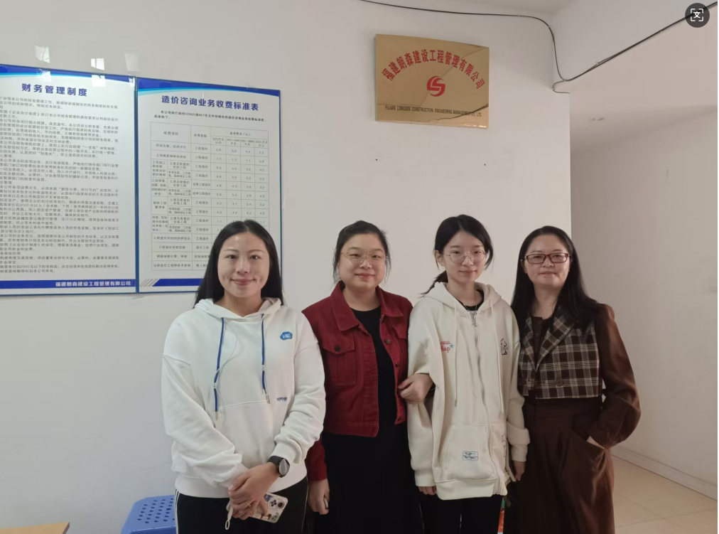 为落实人才培养方案,提高人才培养质量,进一步加强学生实习管理,切实提高专业实习效果,了解学生在外实习的基本情况,2024年11月8日,艺术与建筑系刘燕婷与黄雪清老师前往看望正在福建朗森建设工程管理有限公司实习的学生。