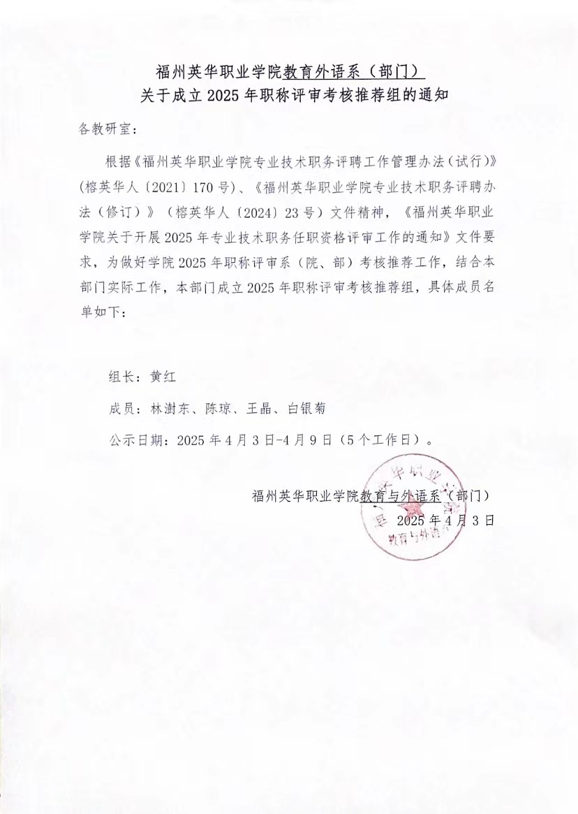 福州英华职业学院教育外语系(部门) 关于成立2025年职称评审考核推荐组的通知